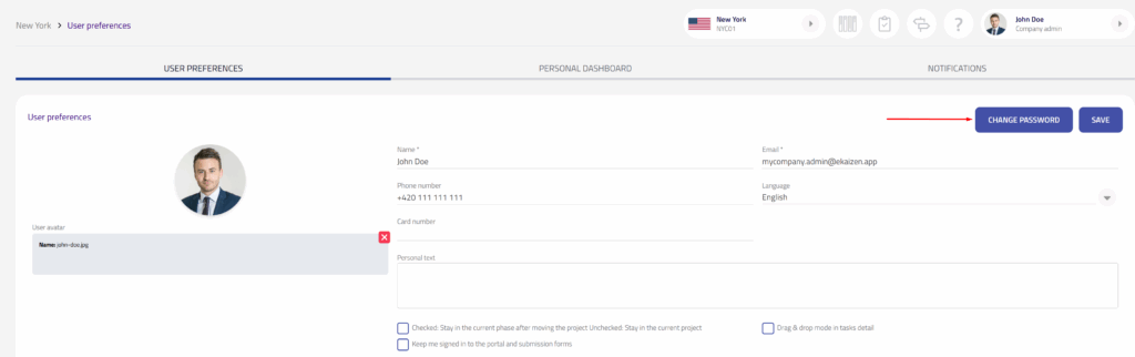 Zůstat přihlášen v portálu a formulářích: Přepínač v „Můj profil“, který vás ponechá přihlášené a použije vaše jméno/e-mail v Portálu eKaizen a v podávacích formulářích (vhodné pro použití na svém počítači).