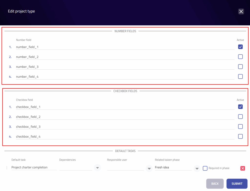 - Přiřazení úkolů k fázím: Úkoly je nyní možné přiřadit ke konkrétním fázím (např. Nové nápady, Ke schválení, V řešení), což usnadňuje organizaci a sledování postupu v jednotlivých etapách projektů. (Lze to provést jak přímo ve workflow konkrétního projektu, tak v šabloně typu projektu – včetně označení úkolů jako povinných pro danou fázi, viz dále.)