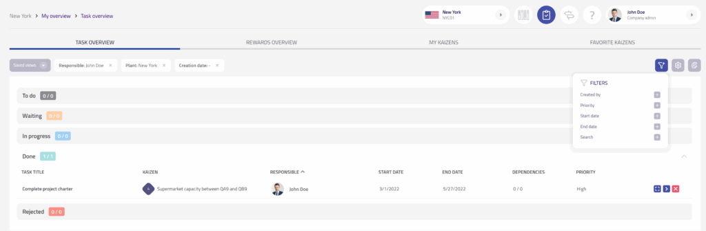 Přehled úkolů byl přepracován tak, aby odpovídal vzhledu Přehledu kaizenů. Uživatelé nyní mohou filtrovat a zobrazovat úkoly lokálně i ve všech závodech, třídit je podle sloupců a přistupovat k podrobným informacím o úkolech v samostatném dialogovém okně.