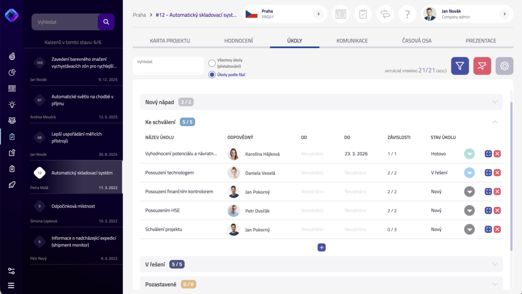 Dobrý nápad nebo analýza problému nestačí. Důležité je, aby se navržená opatření opravdu promítla do každodenní práce. eKaizen pomáhá udržet zlepšování v pohybu – od návrhu řešení až po jeho realizaci. Týmy mají přehled například o: