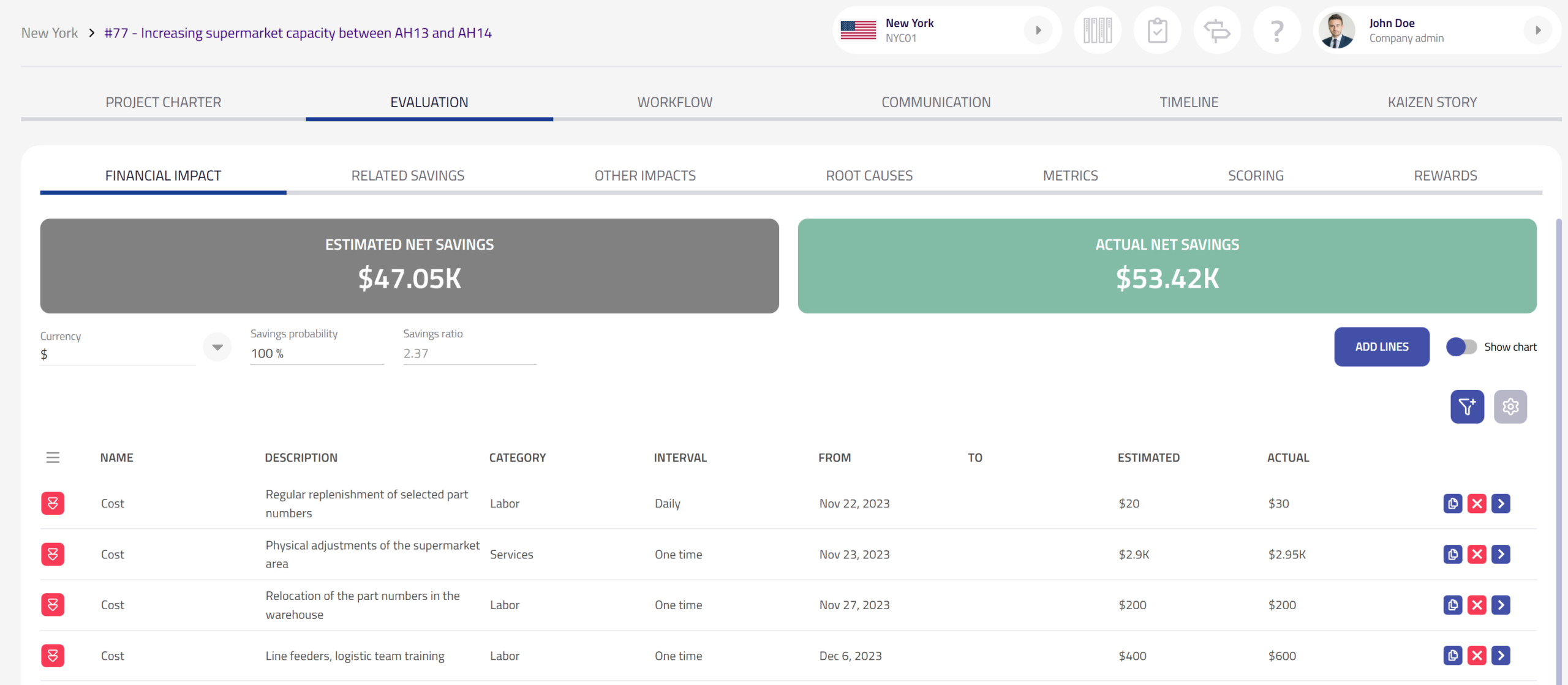 Each kaizens’s cost or benefit can now be categorized. This further improves ROI calculations and ability to assign lines of costs or benefits under the correct category.