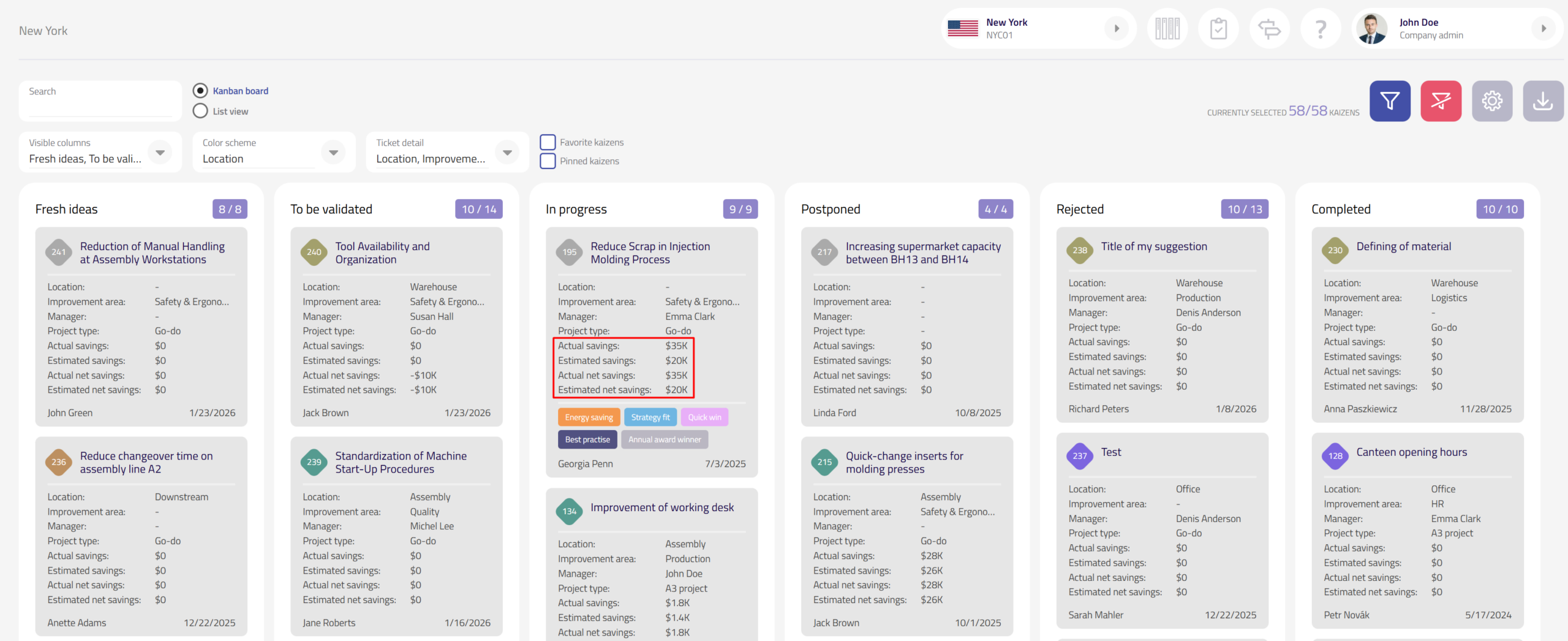 Estimated and actual costs and savings can now be displayed directly on kanban cards in the Kaizen overview, giving teams immediate financial context without opening the project detail.