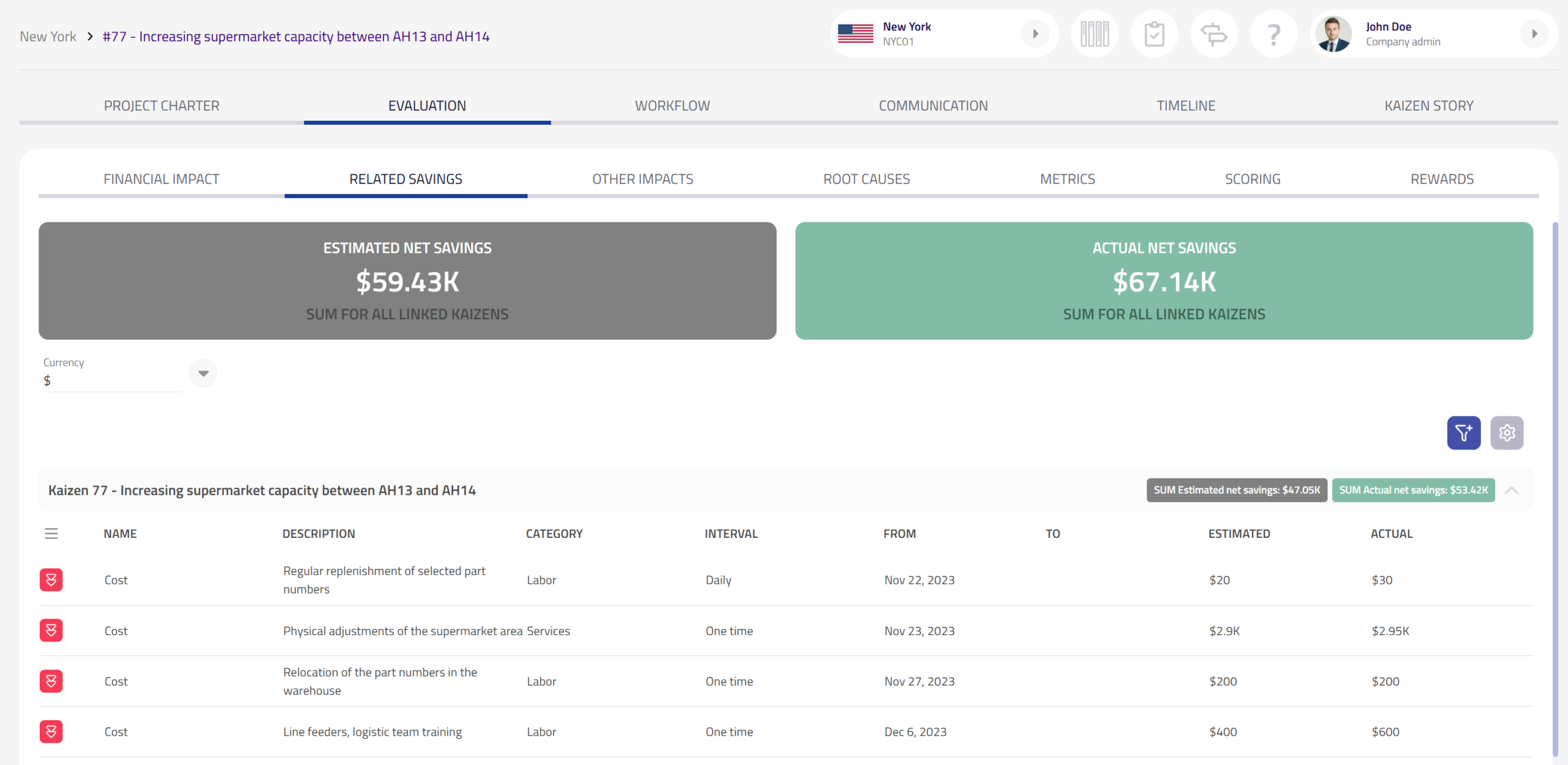 - Related savings tab (Evaluation): When a Kaizen has related kaizens, a new Related savings tab shows a read-only table of costs & savings per related kaizen, per-kaizen totals, and overall totals (edits remain in each source kaizen’s Financial indicators).
