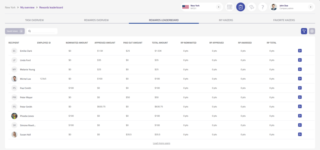 The Rewards leaderboard provides a transparent overview of rewards and reward points earned across Kaizens, combining nominated, approved, and awarded values in one place. With support for reward points as an alternative to monetary rewards, companies gain more flexibility in recognizing contributions while keeping rewards tracking clear, comparable, and easy to manage.